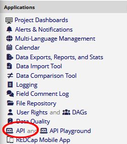 To keep your data safe, REDCap uses an encoded “API token.” This is like a password used only for API transactions with the database. To get your API token, click the API link under Applications in the left sidebar, as shown below. (If you don’t see this link after giving yourself API permissions, try refreshing the REDCap screen, or logging out of the project and logging back in.)