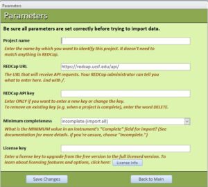 REDCap URL: We’ve pre-filled this field with the correct URL for UC San Francisco. If your REDCap project is hosted elsewhere, you’ll need to replace this URL with the correct URL for your institution. It should be embedded in the code you’ll see if you click the “API playground” link on your REDCap page. If you’re not sure, ask your REDCap administrator for the URL to use for API requests.